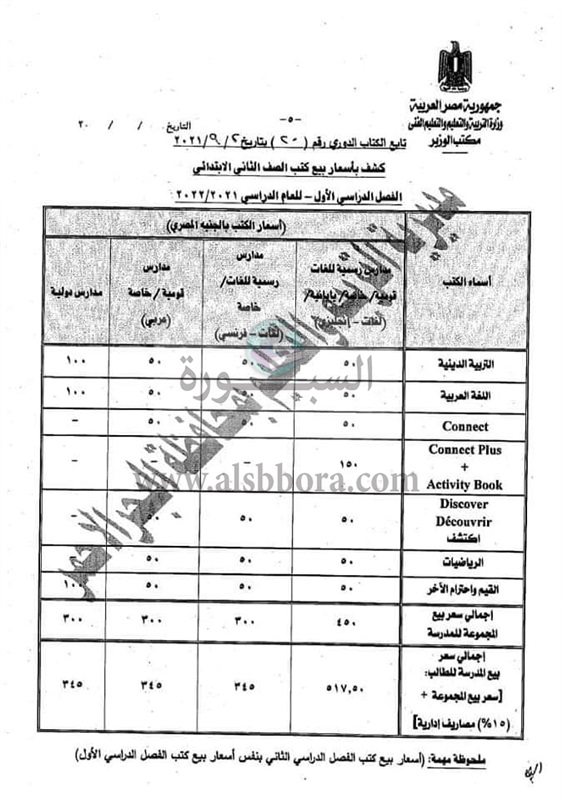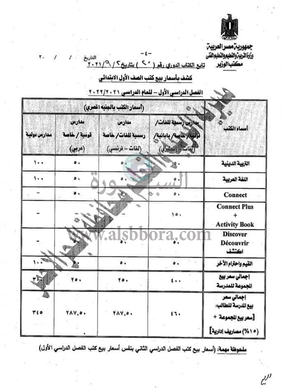 أنه بالنسبة لأسعار بيع كتب الصف الثانى الابتدائى: