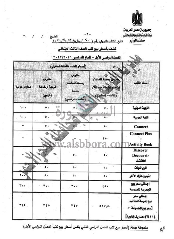 أنه بالنسبة لأسعار كتب الصف الثالث الابتدائي: