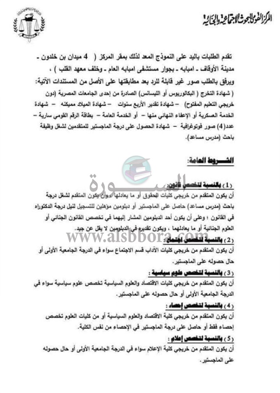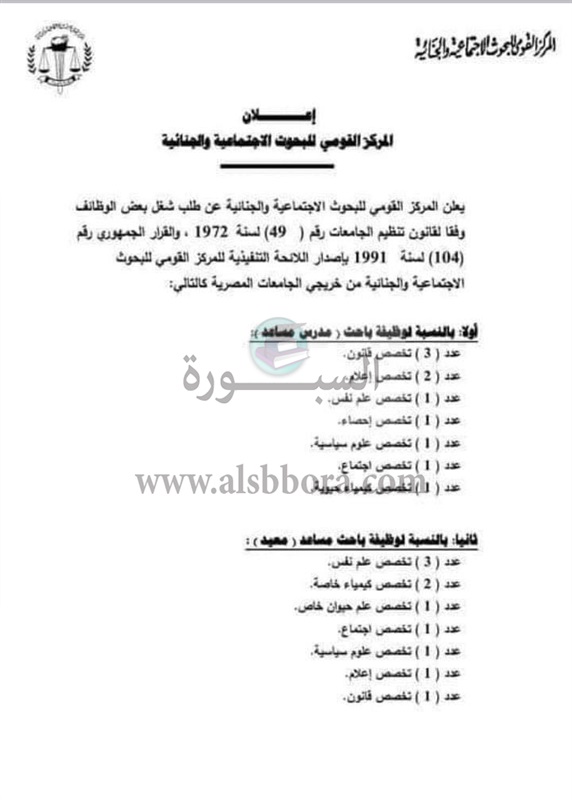 يعلن المركز القومي للبحوث الاجتماعية والجنائية عن شغل وظائف "مدرس مساعد ومعيد" في 14 تخصص وفقا لنص الإعلان التالي: