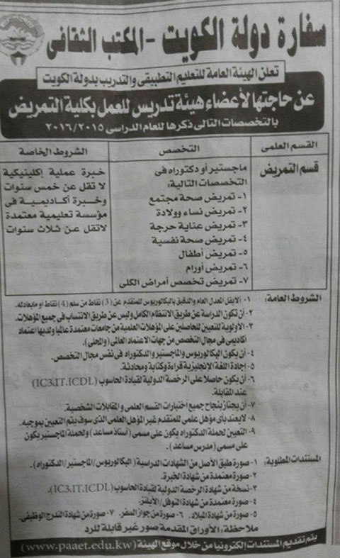تعلن سفارة دولة الكويت بمصر عن أن الهيئة العامة للتعليم التطبيقى والتدريب بدولة الكويت عن حاجتها لاعضاء هيئة تدريس
