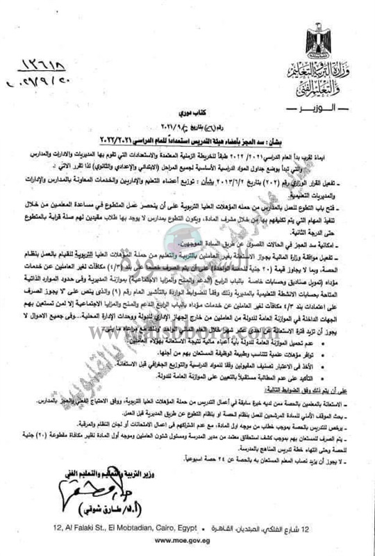 - إمكانية سد العجز في الحالات القصوى عن طريق الموجهين، وتفعيل موافقة وزارة المالية بجواز الاستعانة بغير العاملين بالتربية والتعليم من حملة المؤهلات العليا التربوية للقيام بالعمل بنظام الحصة، وبما لا يجاوز قيمة (20 جنيه للحصة الواحدة)