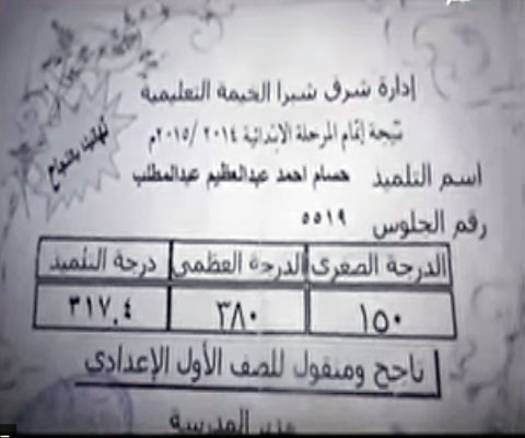 حيث يقول والد الطالب أن ابنة " حسام أحمد عبد العظيم يدرس في المرحلة الإبتدائية في الصف السادس حصل على شهادة نجاح من مدرسة ملحقة المعلمين، التابعة لادارة شرق شبر ا الخيمة التعليمية ولكن الخطير في الامر انه لم يستطع التسجيل في المرحلة الإعدادية لأنه راسب، ويناشد الأهل وزير التعليم للتدخل.