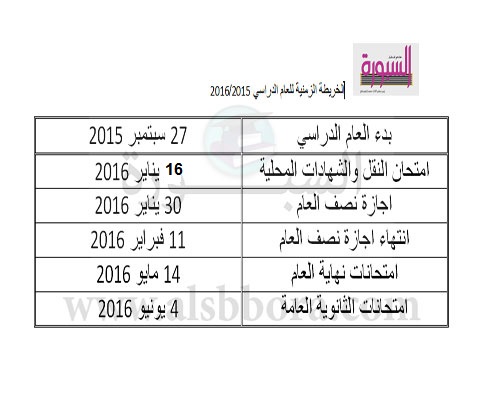 وقد وافق المجلس في اجتماعة علي بدء العام الدراسي يوم السبت الموافق 27 /9 /2015 ، ينتهي في يوم الخميس 2 /6 /2016. وتبدأ امتحانات النقل والشهادات المحلية تبدأ 16 من يناير 2016، مع مراعاة ظروف كل محافظة على حدة ، و إجازة نصف العام الدراسى تبدأ من 30 يناير 2016 حتى 11 فبراير من نفس العام، وامتحانات نهاية العام تبدأ من 14 مايو 2016، و امتحانات الثانوية العامة 4 من يونيو 2016.