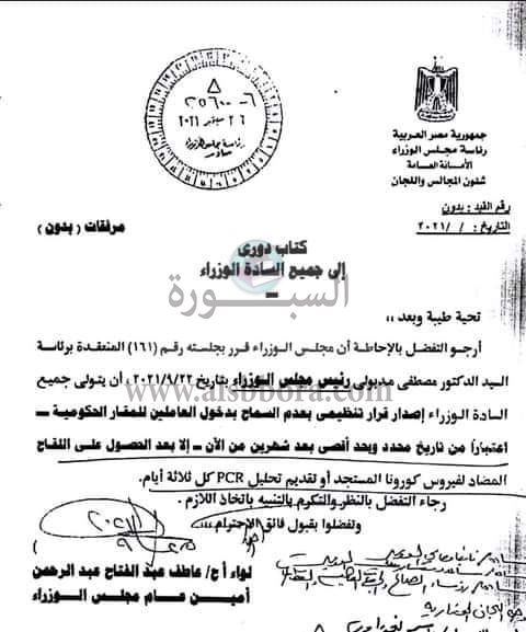 أصدر مجلس الوزراء تنبيها لجميع المحافظين والوزاراء تضمن التنبيه علي جميع العاملين بعدم دخولهم مقار عملهم الا بعد تلقي لقاح كورونا وذلك بحد أقصى شهرين من تاريخه.