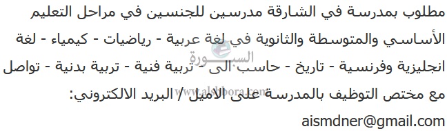 وظيفتك عندنا كبري مدارس الشارقة تعلن عن وظائف جديدة شاغرة للمعلمين والمعلمات الأحد 10/أكتوبر/2021 - 10:57 م أرشيفية facebook twitter whats x facebook twitter rss feed تعلن كبري مدارس الشارقة عن وظائف جديدة شاغرة للمعلمين والمعلمات وفقا لنص الإعلان التالي:للمرة الأولي.. وزير التعليم يلمح لتوقف الدراسة وإحالة المعلمين إلى المنازلعاجل.. "التعليم" تعلن التفاصيل الكاملة لزيادة أكتوبر للمعلمين.. أحسب مرتبكتحذير.. قرار تعليمي خاطيء قد يؤدي لكارثة تنهي العام الدارسي في أيامه الأوليعاجل.. التعليم تعلن عن تكليفات هامة تطبق في جميع محافظات الجمهورية بداية من غدا الأحدعاجل.."انصراف الطلاب من المدارس 11 صباحاً يوميا وتقليل مدة الحصة" يتصدر تصريحات وزير التربية والتعليمتعرف علي هدية وزارة التربية والتعليم للعلمين في العام الدراسي الجديدبيان عاجل من مجلس الوزراء بشأن العام الدراسي الجديدقبل ساعات من بدء العام الدراسي.. "تأجيل الدراسة و تقليل أيام الحضور وعزل الطالب بالمنزل" قرارات نهائية لوزارة التربية والتعليمعاجل.. نقيب المعلمين يكشف إجراءات جديدة تطبق بداية من العام الدراسي الجديدوزير التربية والتعليم يتناسي مطلب المعلمين الأساسي لبدء العام الدراسي الجديدبيان عاجل من مجلس الوزراء بشأن العام الدراسي الجديدبيان حكومي عاجل بشأن تقسيم أيام حضور الطلاب بالعام الدراسى الجديد تزامناً مع الموجة الرابعة لكورونا facebook twitter whats
