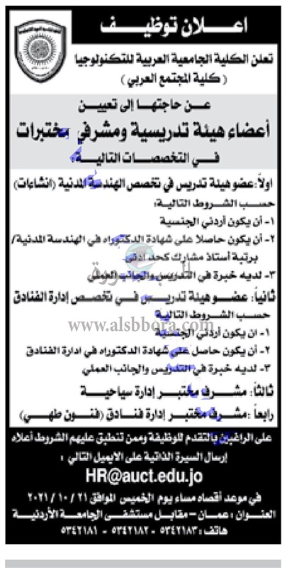 وظيفتك عندنا جامعة أردنية تعلن عن وظائف جديدة شاغرة لأعضاء هيئة التدريس الأربعاء 13/أكتوبر/2021 - 10:32 ص أرشيفية facebook twitter whats x facebook twitter rss feed تعلن جامعة أردنية عن وظائف جديدة شاغرة لأعضاء هيئة التدريس وفقا لنص الإعلان التالي: هام.. "التربية والتعليم" توجه ندأ عاجل لأولياء الأمور بشأن استقرار العملية التعليميةعاجل.. التعليم تعلن عن تكليفات هامة تطبق في جميع محافظات الجمهورية بداية من غدا الأحدعاجل.."انصراف الطلاب من المدارس 11 صباحاً يوميا وتقليل مدة الحصة" يتصدر تصريحات وزير التربية والتعليمتعرف علي هدية وزارة التربية والتعليم للعلمين في العام الدراسي الجديدبيان عاجل من مجلس الوزراء بشأن العام الدراسي الجديدقبل ساعات من بدء العام الدراسي.. "تأجيل الدراسة و تقليل أيام الحضور وعزل الطالب بالمنزل" قرارات نهائية لوزارة التربية والتعليمعاجل.. نقيب المعلمين يكشف إجراءات جديدة تطبق بداية من العام الدراسي الجديدوزير التربية والتعليم يتناسي مطلب المعلمين الأساسي لبدء العام الدراسي الجديدبيان عاجل من مجلس الوزراء بشأن العام الدراسي الجديدبيان حكومي عاجل بشأن تقسيم أيام حضور الطلاب بالعام الدراسى الجديد تزامناً مع الموجة الرابعة لكوروناعاجل.. "التعليم" تعلن التفاصيل الكاملة لزيادة أكتوبر للمعلمين.. أحسب مرتبكعاجل.. التعليم: انتظام الدراسة وتفعيل الحضور والغياب وتقسيم اليوم الدراسي الي فترتينعاجل.. التعليم: حضور الأطفال من رياض الأطفال حتى الصف الرابع الابتدائي وجوبيًا .. وتحذر : " وصلنا لمرحلة حرجة" facebook twitter whats
