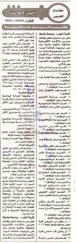 تعلن جامعة طنطا عن وظائف جديدة شاغرة لأعضاء هيئة التدريس وذلك وفقا لنص الإعلان التالي: