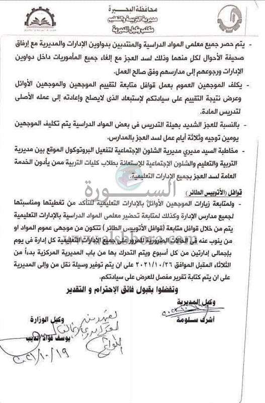 أصدرت مديرية التربية والتعليم في البحيرة قرارا بتكليف الموجهين ثلاثة أيام لسد عجز المعلمين بالمدارس.