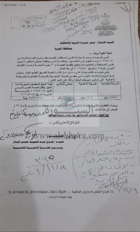 أما عن محافظة الجيزة .. قالت وزارة التربية والتعليم في خطاب رسمي لمدير مديرية التربية والتعليم بالجيزة ، أن الادارة العامة لتنسيق التعليم العام بديوان عام وزارة التربية والتعليم تتمثل فيما يلي :
