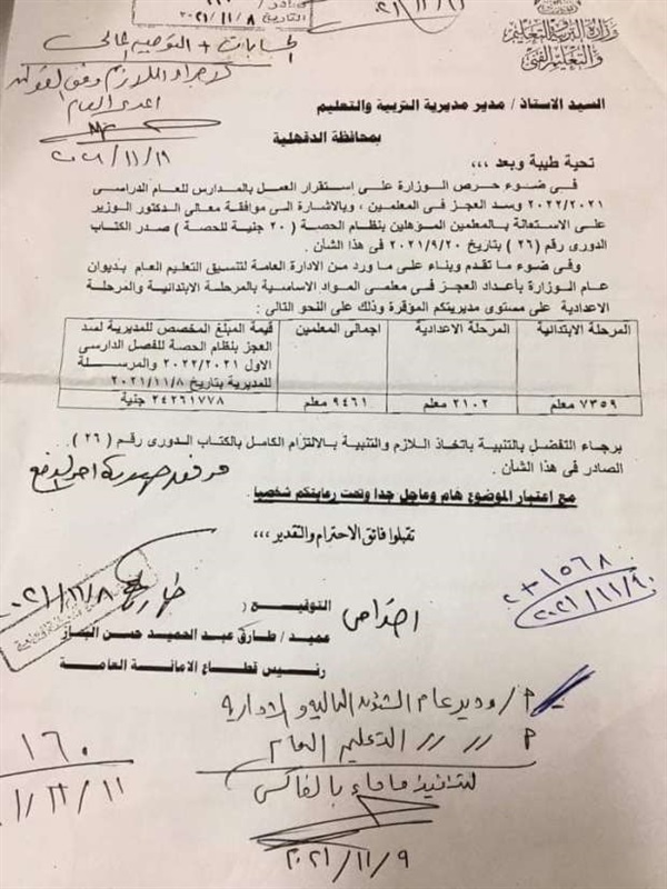 وأضحت وزارة التربية والتعليم، أن قيمة المبلغ المخصص للمديرية لسد العجز بنظام الحصة للفصل الدراسي الأول من العام الدراسي الحالي 2021-2022 تبلغ 24 مليون و 261 ألف و 778 جنيه، مشددا على أنه تم إرسال المبلغ لمديرية التربية والتعليم بالدقهلية يوم 8 نوفمبر 2021.