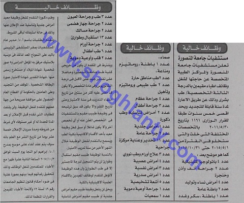 مستشفيات جامعة المنصورة والمراكز الطبية المتخصصة عن عدد من الوظائف التالية: