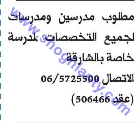 تعلن دولة الامارات عن حاجتها لمدرسين ومدرسات في جميع التخصصات لمدرسسة خاصة بالشارقة (عقد 506466).