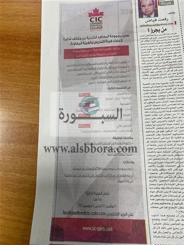 أعلنت مجموعة المعاهد الكندية تعلن عن وظائف شاغرة لأعضاء هيئة التدريس والهيئة المعاونة علما بأن أخر موعد للتقديم السبت المقبل.