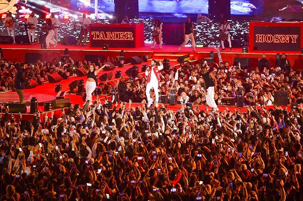 وفاجىء نجم الجيل تامر حسنى جمهوره بدخلة عالمية كعادته على المسرح الذى أعد خصيصاً لهذا الحفل كأكبر مسرح فى العالم، وبدا تامر فى كامل لياقته البدنية مرتديا ملابس "كاجوال" ومرددا أغنية "أول الكلام" وسط عاصفة شديدة من التصفيق وهتافات الجمهور وعشاقه من الشباب والفتيات، وظل يجوب المسرح بخفة شديدة أظهرت مدى لياقته البدنية، وذلك بعد أن قامت بتقديمه الاعلامية فرح على.