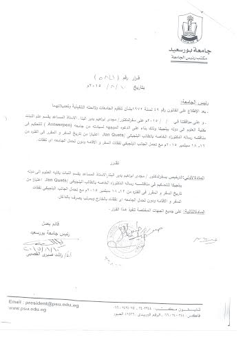 صورة من قرارالموافقة على السفر من رئيس جامعة بورسعيد