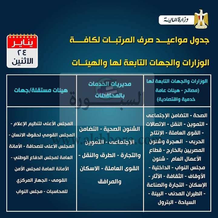 أعلنت وزارة المالية عن جدول صرف مرتبات العاملين بالدولة غدا الإثنين وفقا لنص الإعلان الوزاري التالي: