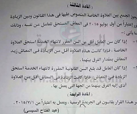 -يجوز الجمع بين العلاوة الخاصة المنصوص عليها في هذا القانون وبين الزيادة قرر إعتباراً من أول يوليو ٢٠١٥ في المعاش المستحق للعامل عن نفسه وذلك مايأتي :-