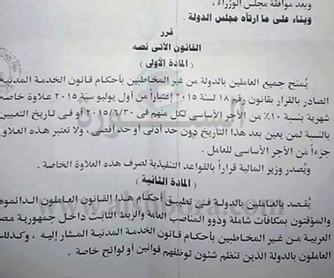 ننشر.. تفاصيل قرار منح 10% علاوة خاصة للعاملين غير المخاطبين بقانون الخدمة المدنية