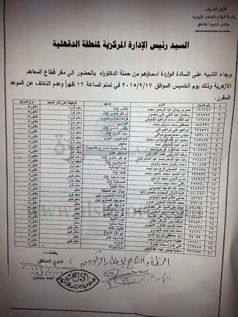 "برجاء التنبية على الوارد اسماؤهم من حملة الدكتوراة بالحضور الى مقر قطاع المعاهد الأزهرية وذلك يوم الخميس الموافق 17/9/2015 فى تمام الساعة 12 ظهرا وعدم التخلف عن الميعاد."