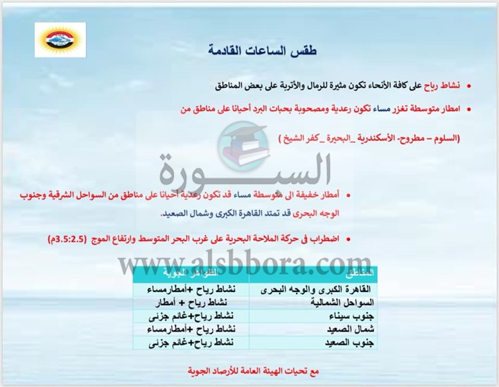 أعلنت هيئة الأرصاد الجوية عن التقلبات الجوية خلال الساعات المقبلة وذلك وفقا للبيان الرسمي للهيئة والذي تضمن الآتي:
