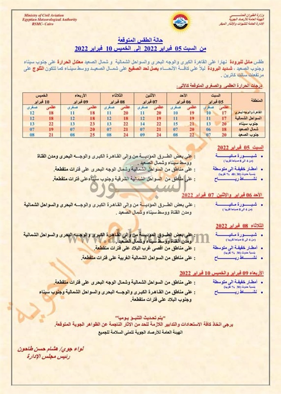 - يسود طقس مائل للبرودة نهارا على القاهرة الكبرى والوجه البحري والسواحل الغربية،على شمال الصعيد، دافئ على جنوب سيناء وجنوب الصعيد