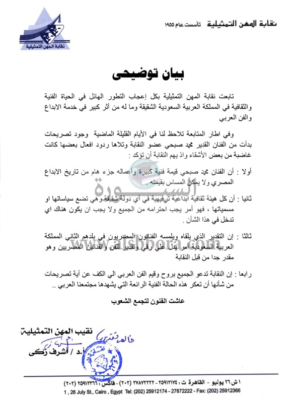 أصدرت نقابة المهن التمثيلية بيانا بشأن التراشق الإعلامي بين الفنان محمد صبحى وهيئة الترفيه السعودية،وتضمن البيان النقاط التالية: