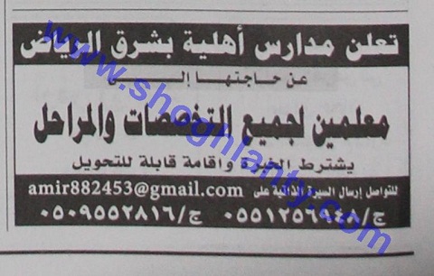 تعلن مدارس أهلية بشرق الرياض عن حاجتها إلي معلمين لجميع التخصصات والمراحل.