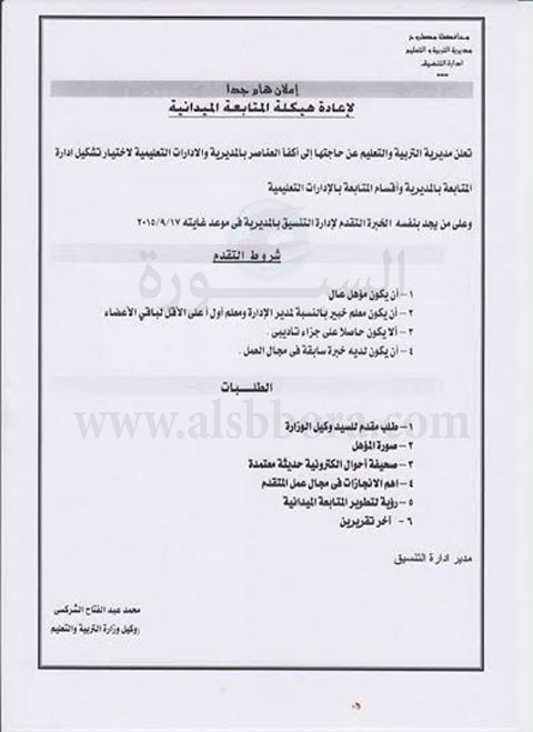أعلنت مديرية التربية والتعليم بمطروح عن حاجتها الي وظائف بإدارة المتابعة بالمديرية واقسام المتابعة بالادارات التعليمية وذالك في موعد غايتة 17/9/2015كما اشار الاعلان الي اهمية توافر عدد من الشروط وهي :-
