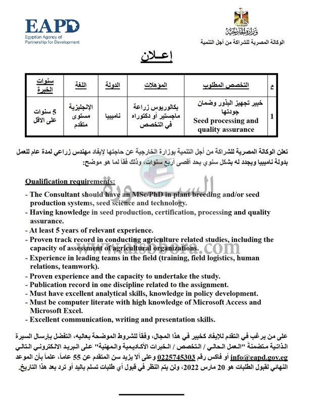 "الوكالة المصرية للشراكة من أجل التنمية بوزارة الخارجية تعلن عن حاجتها لإيفاد مهندس زراعي لمدة عام للعمل بدولة ناميبيا، يجدد له بشكل سنوي بحد أقصى أربع سنوات، وذلك فقاً للشروط والإجراءات الموضحة في الإعلان المرفق."