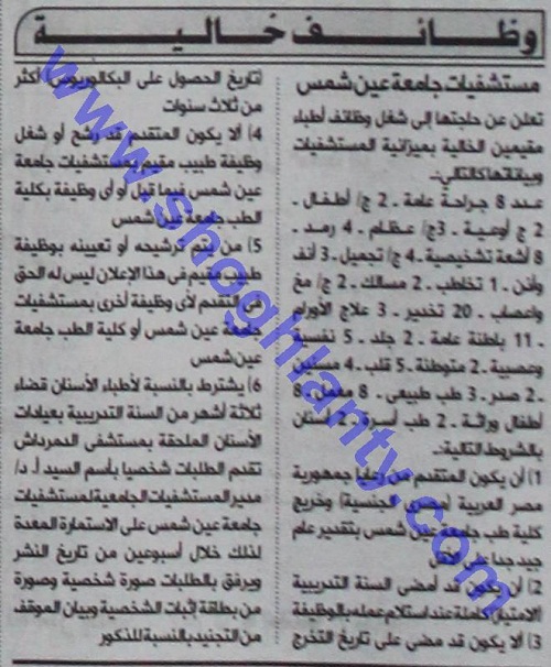 تعلن مستشفيات جامعة عين شمس عن حاجتها الي شغل وظائف أطباء مقيمين وذلك وفقا للشروط التالية