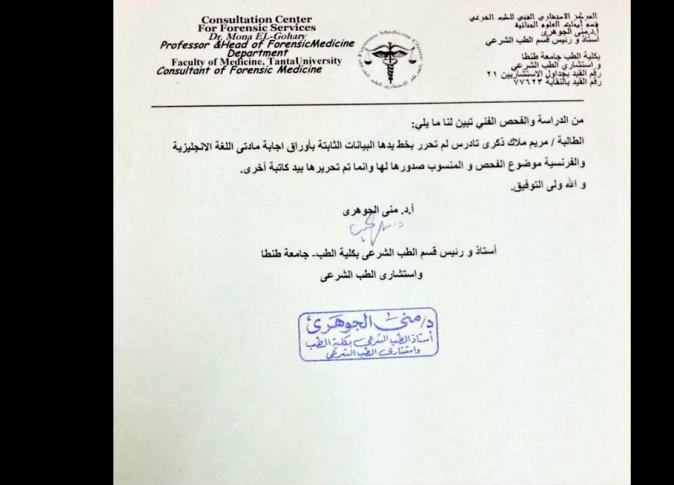 كشف تقرير استشاري لأستاذ ورئيس قسم الطب الشرعي بكلية الطب جامعة طنطا ، عن وقوع تزوير في أوراق الطالبة مريم ملاك، المعروفة إعلاميًا بـ«طالبة صفر الثانوية العامة »، وذلك قبل صدور تقرير اللجنة الخماسية لخبراء الطب الشرعي حول الواقعة، الثلاثاء اللمقبل