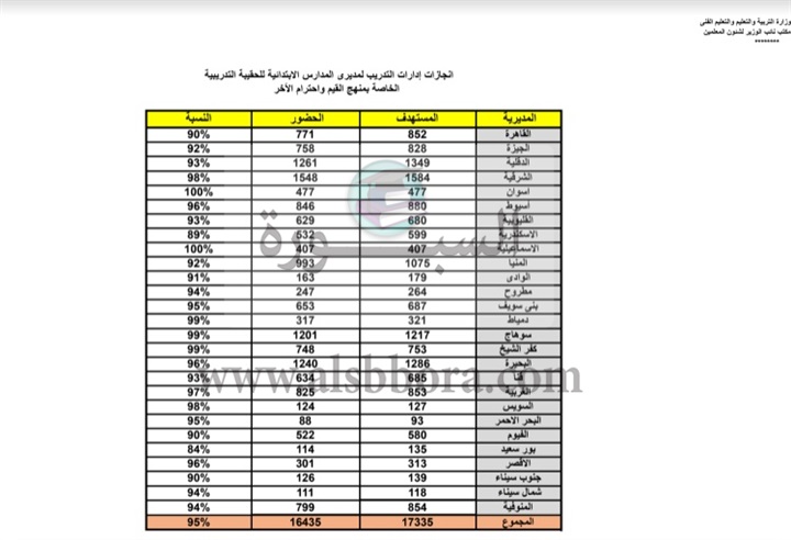 نشرت وزارة التربية والتعليم جدول تدريبات مديري المدارس الابتدائية لمنهج القيم واحترام الأخر وتضمن الجدول التالي: