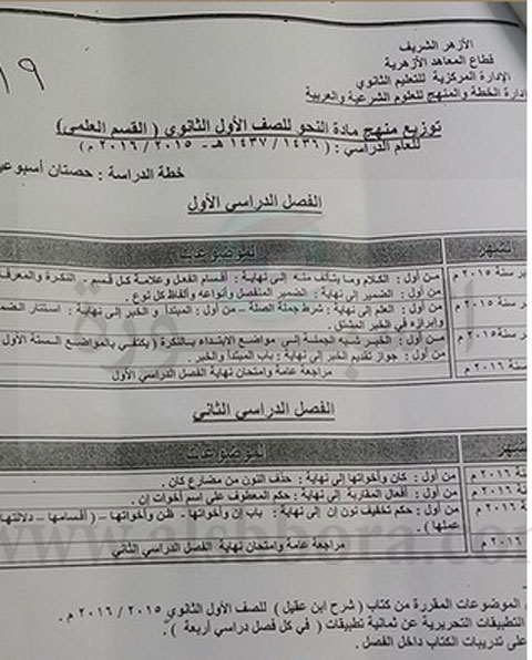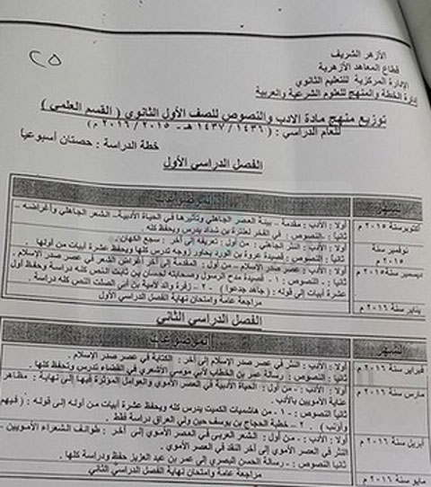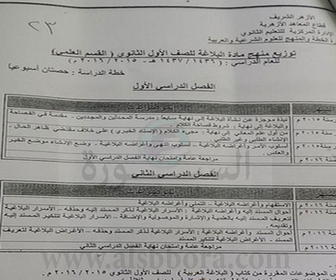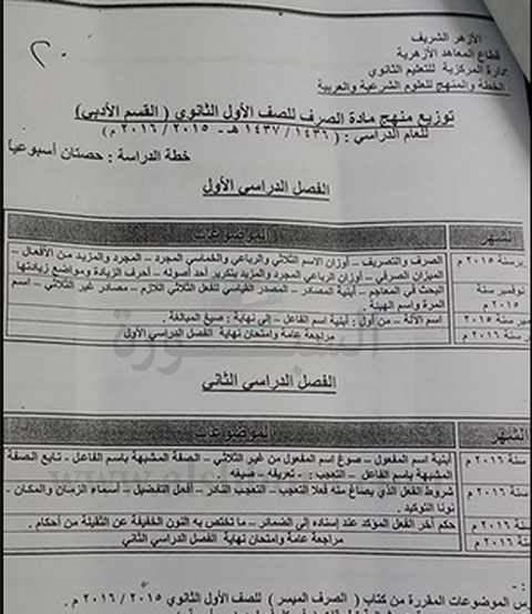 أرسلت الادارة المركزية لقطاع المعاهد الأزهرية المناهج الجديدة في اللغة العربية، إلى المناطق الأزهرية استعدادا للعام الدراسى 2015 / 2016 وتم التنبية على الإدارات بتوزيعها على المعاهد تزامنا مع عمل الجداول المدرسية وتوزيع المناهج على المدرسين بالقسم الآدبى والعلمى.