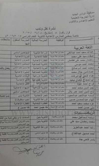 صدرت نشرة التنقلات لمعلمي الوادي الجديد بإدارة الخارجة التعليمية و كانت أكبر حركة ندب في مادة الرياضيات و لأول مرة تصدر النشرة مبكرا و ليس في المرحلة الأخيرة قبل بدأ الدراسة.