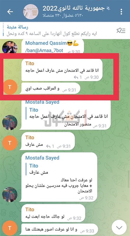 بعد ساتين من بدء امتحان اللغة العربية للثانوية العامة، تداول رواد مواقع التواصل الاجتماعي، صور لمحادثة بأحد مجموعات الغش على تطبيق "تليجرام"، لمجموعة من الطلبة داخل اللجان.