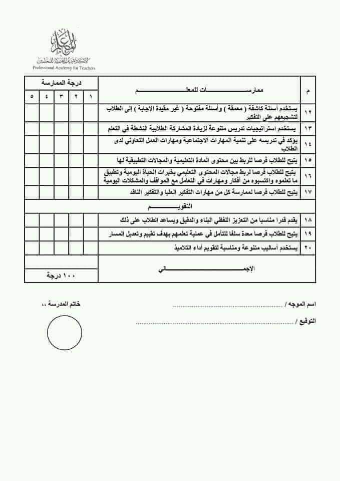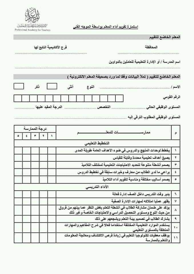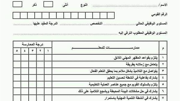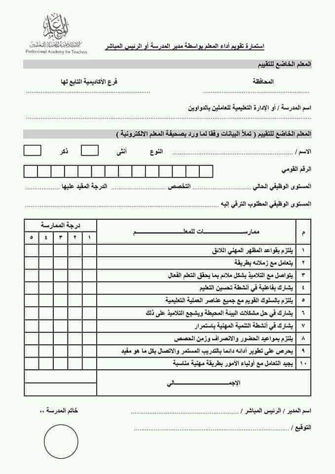 استمارة تقويم أداء المعلم بواسطة مدير المدرسة او الرئيس المباشر