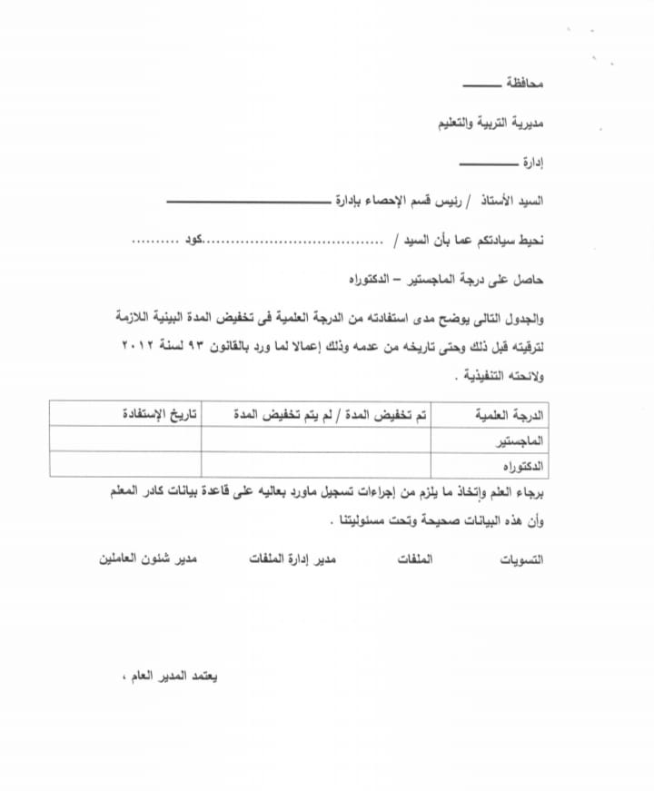 اقرار بحصول المعلم على درجة الماجستير او الدكتوراة أن وجد