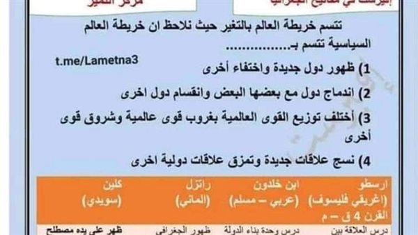 وتعد المراجعة النهائية لطلاب وطالبات الثانوية العامة التى ينشرها موقع السبورة من اقوى وابرز المراجعات النهائية، والتى لن يخرج عنها امتحان آخر العام فى جميع المواد عن تجربة من خلال السنوات الماضية، حيث تأكد من خلال المراجعة النهائية حصول الطلاب على اكثر من 90% من الدرجات بعد المتابعة من خلال المراجعة النهائية فى الموقع، بالاضافة الى الاسئلة المتوقعة فى امتحان الثانوية العامة بالنص..…….. مراجعة نهائية.. مراجعات نهائية.. مراجعة ليلة الامتحان.. الجغرافيا.. حل اسئلة الجغرافيا.. روشتة التفوق.. الخلطة السحرية.. مفاتيح الجغرافيا.. الثانوية العامة