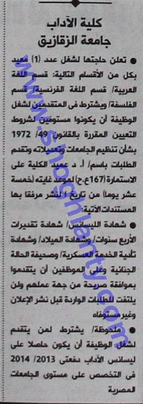 تعلن جامعة الزقازيق عن حاجتها إلي أعضاء هيئة تدريس ومعاونيهم وذلك طبقا للقانون رقم 49 لسنة 1972 لتنظيم الجامعات.