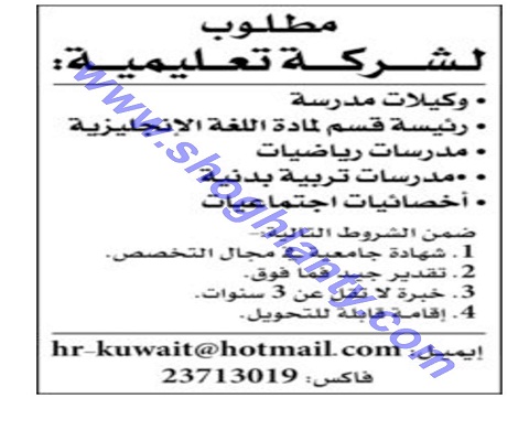 تعلن دولة الكويت عن حاجتها لمعلمين في التخصصات التالية: