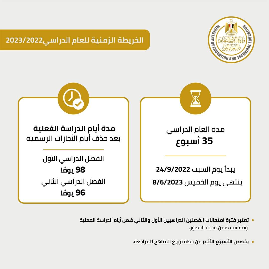 يبدأ العام الدراسي يوم السبت 24 سبتمبر 2022 وينتهي يوم الخميس 8 يونيو 2023 ويستمر لمدة 35 أسبوع، وتكون مدة أيام الدراسة الفعلية بعد حذف أيام الإجازات الرسمية 98 يوم للفصل الدراسي الأول و96 يوم للفصل الدراسي الثاني.…… الخريطة الزمنية للعام الدراسى …… جدول امتحانات الثانوية العامة للدور الثاني ……… امتحانات الثانوية العامة …….. الثانوية العامة ………. جدول امتحانات الثانوية …….. نتيجة الثانوية العامة
