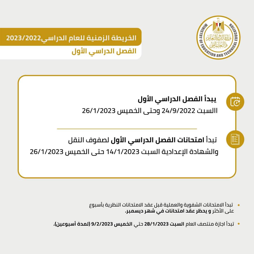 كما تبدأ امتحانات الفصل الدراسي الأول لصفوف النقل والشهادة الإعدادية يوم السبت الموافق 14-1-2023 حتى الخميس 26-1-2023، كما تبدأ الامتحانات الشفوية والعملية قبلب عقد الامتحانات النظرية بأسبوع على الأكثر ويحظر عقد امتحانات فى شهر ديسمبر.…… الخريطة الزمنية للعام الدراسى …… جدول امتحانات الثانوية العامة للدور الثاني ……… امتحانات الثانوية العامة …….. الثانوية العامة ………. جدول امتحانات الثانوية …….. نتيجة الثانوية العامة