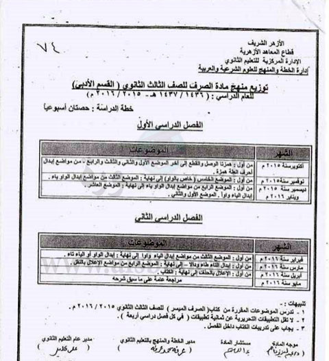 أرسلت الادارة المركزية لقطاع المعاهد الأزهرية المتاهج الجديدة الى المناطق الأزهرية استعدادا للعام الدراسى 2015 / 2016 وتم التنبية على الإدارات بتوزيعها على المعاهدت تزامنا مع عمل الجداول المدرسية وتوزيع المناهج على المدرسين للمرحلة الثانوية