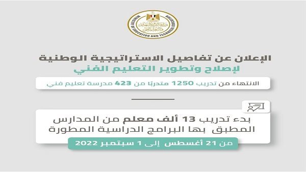 وأوضحت الوزارة أنه يجري حاليًا استئناف تدريب كوادر التعليم الفني، بمشاركة شركاء التنمية مثل برنامج TVET الممول من الاتحاد الأوروبي والحكومة المصرية، ومشروع دعم التشغيل ومشروع الدعم الفني لمبادرة التعليم الفني الشامل الممول من الحكومة الألمانية عن طريق الوكالة الألمانية للتعاون الدولي، ومشروع قوى عاملة مصر الممول من هيئة المعونة الأمريكية حيث يستهدف قطاع التعليم الفني تدريب عدد (40) ألف معلم استعدادًا للعام الدراسي الجديد 2022-2023.
