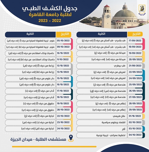 كما تم تحديد يوم 10 أكتوبر لتوقيع الكشف الطبي على طلاب كلية الحاسبات والمعلومات من حرف (أ) إلى حرف (ض)، ويوم 11 أكتوبر لطلاب كلية الحاسبات والمعلومات من حرف (ط) إلى حرف (ي)، و12 أكتوبر لطلاب كلية الزراعة من حرف (أ) إلى حرف (ض)، و13 أكتوبر لطلاب كلية الزراعة من حرف (ط) إلى حرف (ي)، و15 أكتوبر لطلاب كلية دار العلوم من حرف (أ) إلى حرف (ض)و 16 أكتوبر لطلاب كلية دار العلوم من حرف (ط) إلى حرف (ي)، و17 أكتوبر لطلاب كلية الآداب من حرف (أ) إلى حرف (ذ)، و18 أكتوبر لطلاب كلية الآداب من حرف (ر)، إلى حرف (ي)، و19 أكتوبر لطلاب كلية الحقوق من حرف (أ) إلى حرف (ذ)، و20 أكتوبر لطلاب كلية الحقوق من حرف (ر) إلى حرف (ي). كما تم تحديد يوم 22 أكتوبر لتوقيع الكشف الطبي علي طلاب كلية التجارة من حرف (أ) إلى حرف (خ)، و23 أكتوبر لطلاب كلية التجارة من حرف (د) إلى حرف (ص)، و24 أكتوبر لطلاب كلية التجارة من حرف (ض) إلى حرف (ي).