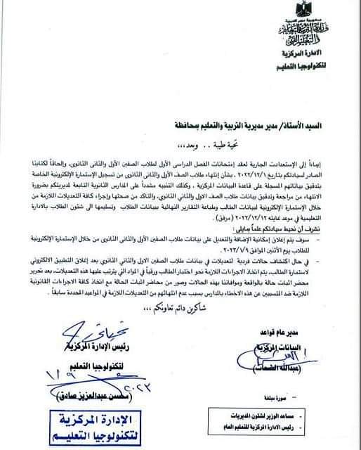 وارسلت وزارة التربية والتعليم والتعليم الفنى، خطابات الى جميع المديريات تحذرهم فيه، عدم تعديل بيانات أى طالب، بعد اغلاق التطبيق الالكترونى، بشأن استمارة التقديم لامتحانات الفصل الدراسى الاول، والذى سوف يعقد يوم السبت المقبل.
