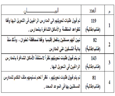 حيث بلغ عدد طلبات التحويل بين المدارس ، المقدمة من أولياء أمور الطلاب 425 طلب ، أسفرت نتيجة الفحص عن مايلــــــى :-