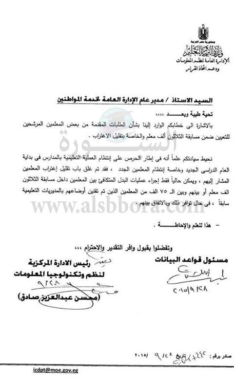 جاء ذلك من خلال رد وزارة التربية والتعليم علي خطاب موجه لها من مدير عام الإدارة العامة لخدمة المواطنين واليكم نص خطاب الوزارة:-