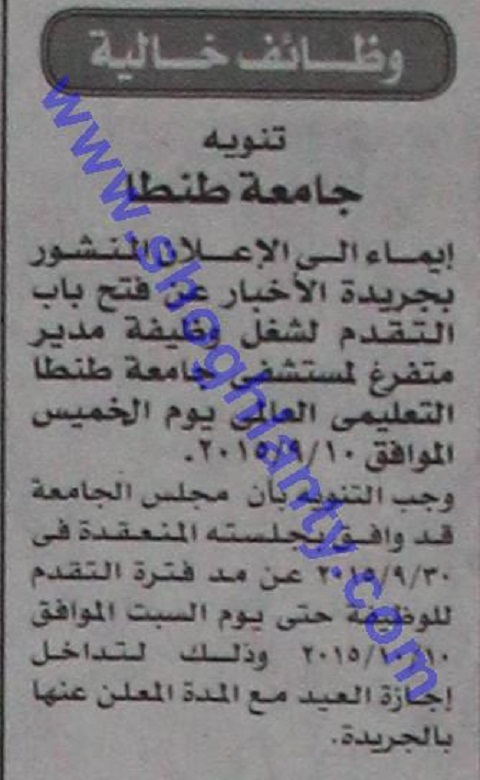 تعلن جامعة طنطا عن وظائ شاغرة جديدة في عدد من التخصصات وذلك طبقا للإعلان الاتي:-