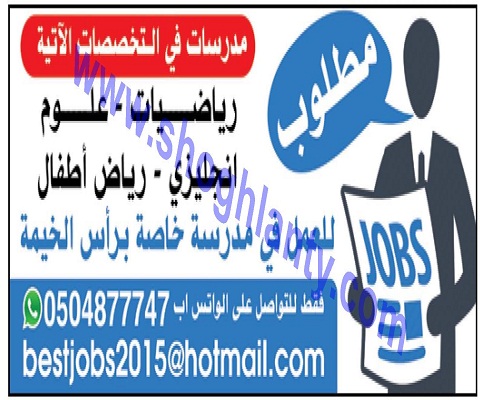 تعلن مدرسية خاصة بإمارة رأس الخيمة بدولة الامارات العربية المتحدة عن حاجتها للتعاقد مع معلمين في المواد التالية: